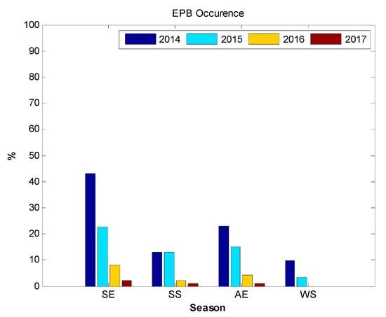 It can be seen from Figure 3 that the plasma bubble occurrence was greater in the spring equinox than in the autumn equinox, especially during the high solar activity years of 2014 and 2015, indicating that the seasonal variations in plasma bubble occurrence presented equinoctial asymmetry. As for the solstices, the plasma bubble activity was more frequent in the summer solstice than in the winter solstice. In the winter solstice, there were no plasma bubbles during the low solar activity years of 2016 and 2017 (Figure 3). This indicated that solstitial asymmetry also existed in seasonal variations in plasma bubble occurrence.