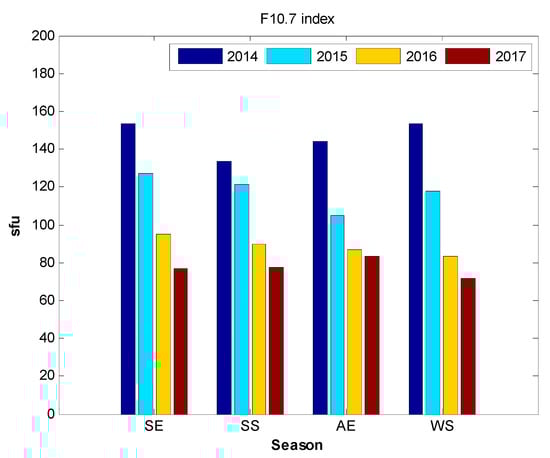 The average solar F10.7 index for different seasons during each year from 2014 to 2017. SE, SS, AE, and WS represent the spring equinox, summer solstice, autumn equinox, and winter solstice, respectively.