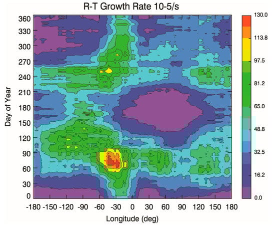 As seen in Figure 5, the R–T growth rate was high during the two equinoxes and low during the two solstices over the Hong Kong area (about longitude 110–120°). In addition, there were more days that the growth rate was greater than 60*10−5/s (light green area) during the spring equinox than the autumn equinox. These can explain the characteristics of plasma bubble occurrence, namely that a larger value was observed during the two equinoxes and it showed equinoctial asymmetry. During the two equinoxes, the solar terminator aligned with the geomagnetic field, leading to enhanced plasma bubble activity [].