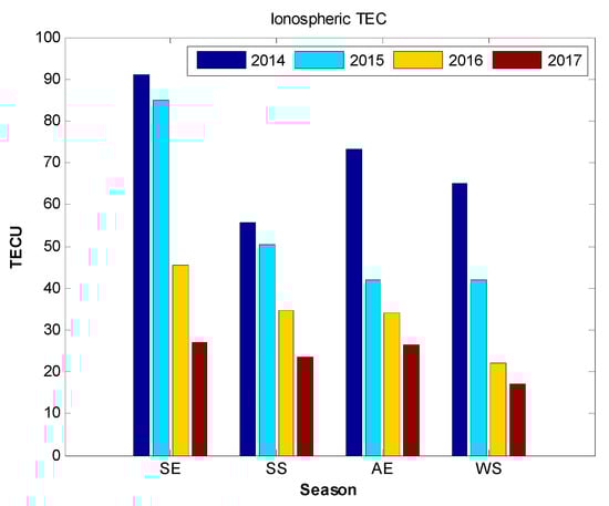 As shown in Figure 4, differences in solar activity during the two equinoxes was not obvious, suggesting that it was not the cause for the equinoctial asymmetry. Kil et al. [] suggested the plasma density might exert an important effect on the seasonal variations in plasma bubble occurrence. Sripathi et al. [] indicated that electron density was important to the formation of equinoctial asymmetry. Using GIM, we calculated the average ionospheric TEC (integrated electron density) at 18:00 LT over the Hong Kong area for different seasons during each year from 2014 to 2017, shown in Figure 6. As seen in Figure 6, ionospheric TEC during the spring equinox was significantly larger than during the autumn equinox, especially in high solar activity years. This result suggested the ionospheric TEC (or electron density) was likely an important factor for the equinoctial asymmetry. According to Equation (3), ionospheric TEC is not an explicit parameter to calculate the R–T growth rate. It could affect the R–T growth rate by the variation of the polarization electric field. When the F-region TEC was large, short circuiting of the polarization electric field driven in the F-region weakened, so that a larger polarization electric field was generated []. Then, the expression in Equation (3) became large (getting close to unity), leading to a large R–T growth rate.