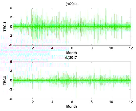 Ionospheric detrended TEC (dTEC) series extracted by GNSS station HKKT during the years of 2014 and 2017.
