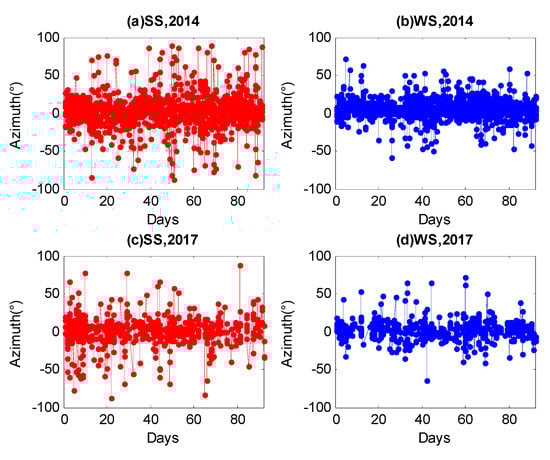 Propagation direction of ionospheric gravity waves (GWs) at 17:30–18:30 LT for the two solstices during the years of 2014 and 2017. SS represents the summer solstice and WS represents the winter solstice. Here, the scope of the azimuth is −90° to 90°.
