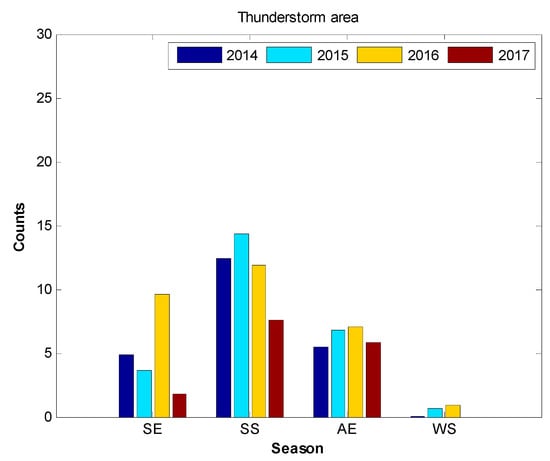 The above analysis suggested the GW seeding mechanism was responsible for the formation of solstitial asymmetry in plasma bubble occurrence over the Hong Kong area. The source of the GWs needs to be further explored. According to the local VLF detection network, the Hong Kong area had frequent thunderstorm activity during March–October. Using the processing method in Tang et al. [], we obtained the average thunderstorm coverage area (grid counts) for different seasons during each year from 2014 to 2017, shown in Figure 9. As seen in Figure 9, thunderstorm activity during the summer solstice was significantly stronger than during the winter solstice. Tang et al. [] analyzed the relationship between thunderstorms and the ionospheric GWs over the Hong Kong area during the years of 2014–2017. Their research indicated that thunderstorm events were the main source of GWs, especially during high thunderstorm days, such as the summer solstice.