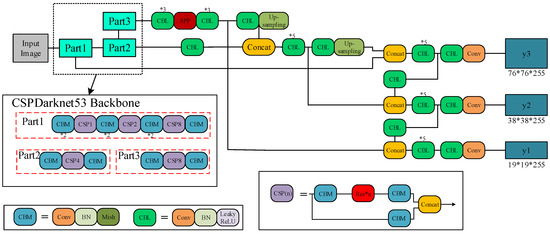 Figure 2 clearly describes the neural network structure of the building detection algorithm. CBL is the most basic component of the neural network, consisting of a convolutional (Conv) layer, a batch normalization (BN) layer, and a leaky rectified linear unit (ReLU) activation function. In the CBM, the Mish activation function is used to replace the leaky ReLU activation function. Moreover, a Res unit exists to construct a deeper network. The CSP(n) consists of three convolutional layers and n Res unit modules. The SPP module is used to achieve multiscale integration. It uses four scales of 1 × 1, 5 × 5, 9 × 9, and 13 × 13 for maximum pooling [22].