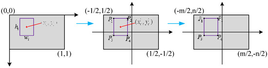 The conversion process is shown in Figure 3. Considering the four corner points of the prediction frame as an example, the position of the prediction frame output by YOLO can be converted into the image coordinate system using the following method. First, the YOLO output information (width, height, and image center position) is converted into a normalized coordinate system with the image center as the origin.