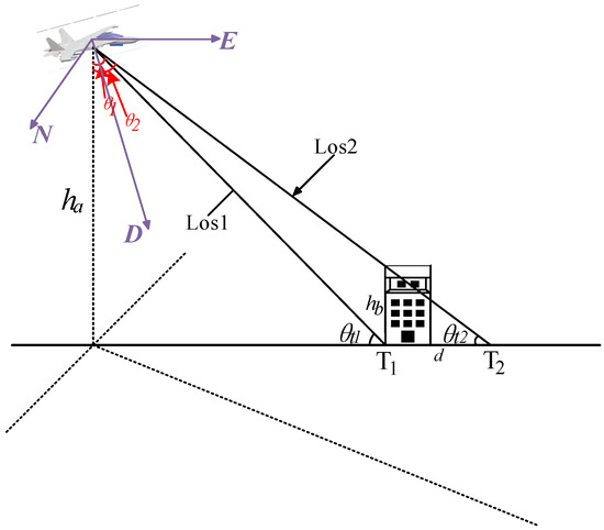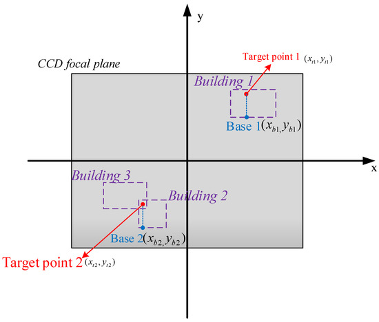 The building target location algorithm aims to obtain accurate geo-location of the target point. The aerial cameras may produce inverted images because of the structure of the camera’s optical system and the scanning direction. However, the image is rotated in post-processing, so the image results still present a positive image. It is found that the top and bottom of the building usually have the same latitude and longitude , but they differ in the height (h). Considering that no elevation error exists in the positioning result of the bottom of the building calculated by the collinear equation, the precise latitude and longitude information of the bottom of a building can be used as the overall building latitude and longitude. Furthermore, the height of targets on the building can be calculated by the algorithm provided in this section to improve the positioning accuracy of the building target.