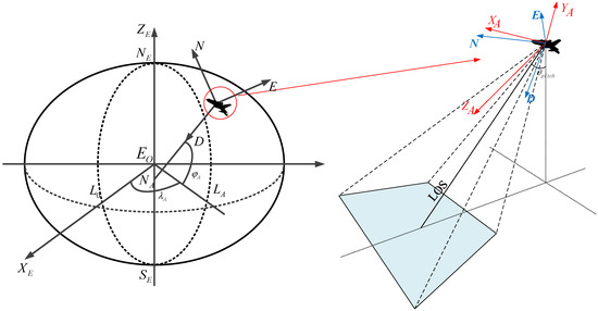 The earth-centered earth-fixed (ECEF) coordinate frame, also known as the earth coordinate frame, can be used to describe the position of a point relative to the earth’s center. The coordinates of the target projection point must be converted to the ECEF coordinate frame to establish the collinear equation in the earth coordinate frame. This process usually requires three coordinate frames: geographic coordinate frame, aircraft coordinate frame, and camera coordinate frame. Figure 10 is a schematic diagram of the corresponding coordinate frames.