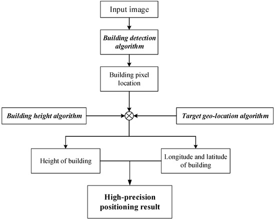 The precise geo-location information of the building can be obtained using the above algorithm. Meanwhile, the precise geographic information of a target on the building consists of two parts: the latitude and longitude of the bottom of the building and the height of the target point . The complete positioning process is illustrated in Figure 11.