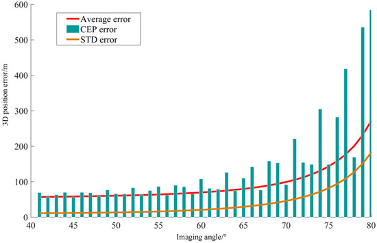 Figure 12 shows a comparison of the calculation results of the three error evaluation criteria when the simulation positioning target is located on a building with the height of 70 m. The specific simulation parameters are presented in Table 1. The horizontal axis of the image is the change in the imaging angle, and the vertical axis is the error value. The figure shows that, as the imaging angle increases, the three error types exponentially increase. The larger the imaging inclination, the greater is the positioning error caused by the height of the building. When the imaging angle is 75°, the average positioning error is close to 150 m. Additionally, although the overall change of CEP shows an increasing trend, CEP does not increase regularly with the increase in the imaging angle. This is caused by the calculation principle of CEP. The building target positioning errors include large height errors, and CEP ignores such errors. CEP is usually aimed at 2D plane errors and treats all positioning results as the same plane; thus, CEP is not suitable for error analysis of targets on buildings. Therefore, the analysis of positioning error in this study mainly uses the average positioning error.