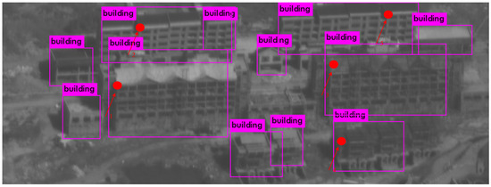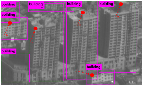 In this section, the actual working effect of the established building target geo-location algorithm is tested. The test data include the oblique aerial remote sensing image captured by the airborne camera. The building target geo-location algorithm and traditional positioning algorithm proposed in this study are used to locate the target simultaneously. The effectiveness of the building target positioning algorithm was verified by comparing the positioning results of the two algorithms. The standard latitude and longitude information of the target is measured by a single-station handheld differential global position system (DGPS), and the precise elevation information of the building is measured by an electronic total station. The accuracy of the DGPS used in the experiment is within 0.5 m, which is sufficient to meet the requirements as a standard reference value. To prove the wide applicability of the algorithm, two experimental pictures were obtained from two different aerial photographs. In the figure, the top layer of some buildings was randomly selected as the target point, and the positioning results of the different algorithms were compared. During the positioning process, the building detection algorithm was used to detect the remote sensing image. The results are shown in Figure 15 and Figure 16. Figure 15 mainly includes shorter buildings (<10 floors), and Figure 16 includes taller buildings (>10 floors). The parameters of the aircraft and camera during image acquisition are presented in Table 2.