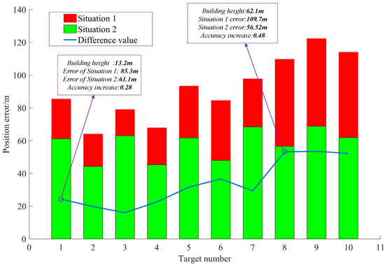 A comparison of the positioning results of the two algorithms is shown intuitively in Figure 17. Situations 1 and 2 in the figure are the positioning results of the target using traditional positioning algorithms and the proposed building target positioning algorithm, respectively. The order of the target points in the figure is arranged according to the actual height of the target (i.e., from low to high). As shown in the figure, regardless of whether the target is on a high-rise or low-rise building, the traditional positioning algorithm causes a large positioning error. Conversely, the proposed building target positioning algorithm improves the positioning accuracy by 20–48%. In summary, the algorithm proposed in this study can calculate the elevation of the building target effectively and can correct the latitude and longitude to a certain extent. This is widely applicable to various oblique aerial remote sensing images.