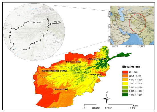 Afghanistan is located between latitudes of 29°30′–38°40′ North and longitudes 60°30′–74°50′ East, covering approximately 650,000 km2 (Figure 1). The lowland plains in the south of Afghanistan experience extreme seasonal variations in temperature, with average summer (June to August) temperature exceeding 33 °C and mean temperature around 10 °C in winter (December to February). The majority of the country experiences very low temperatures all year round and is at high altitude. The highest region’s average summer temperatures do not exceed 15 °C, while winter temperatures are below zero. Rainfall is very scarce in Afghanistan, with higher amounts received in the northern highlands starting in March and April. In the more arid lowlands, rainfall is rare and very unpredictable [49,51] (Figure 1). There are five major and distinct river basins defined in Afghanistan those are: the Amu Darya (ADW), Harirod-Murghab (HMW), Hilmand (HW), Kabul (KW) and Northern (NW) [52,53,54]. The ADW originates from the High Pamir Mountains of Afghanistan and Tajikistan and is surrounded in the north by the Ab-i Pamir River, and in the south by the Wakhan River. The ADW generates 57% of the total river flow in Afghanistan. The source of HMW is the western slope of the Koh-i Baba Mountains and Murghab (Tir Band-i Mountains in Turkistan). The HMW contributes to a small 4% of the total annual flow in Afghanistan. The HW is the largest basin in Afghanistan which covers the southern half of the country, drain water from the Sia Koh Mountains in Hirat province to the eastern mountains in Gardez province and the Parwan Mountains northwest of Kabul. Though the HW shares about 43% of the national territory it drains only 11% of the total annual flow of Afghanistan. Starting from the Hindu Kush Mountains, the KW covers 700 km till flowing to the Indus River, Pakistan [55]. The KW shares 12% of the national territory, 23% of the total settlements, drains 26% of the total annual water flow, and nearly 35% of the total population of Afghanistan. The basin further divided in 3 major sub-basins based on its physiographic and hydro-climatic parameters those are Lower Kabul, Panjshir and Logar-Upper Kabul. The NW takes its sources in the high mountains of the central highlands and is the least annual flow contributing basin in Afghanistan by only 2% of the total (Figure 1).