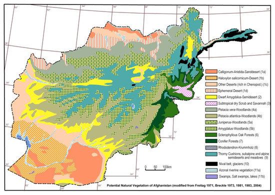 Afghanistan main vegetation types are shown in Figure 2 (natural vegetation of Afghanistan). They include: Calligonum-Aristida, sand desert (1a); Haloxylon salicornicum, desert (1b); other deserts (rich in chenopod) (1c); ephemeral desert (1d); dwarf Amygdalus, semidesert (2); subtropical dry scrub and savannah (3); Pistacia vera, woodlands (4a); Pistacia atlantica, woodlands (4b); Juniperus-woodlands (5a); Amygdalus, woodlands (5b); sclerophyllous oak forests (6); conifer forests (7); Rhododendron-Krummholz (8); thorny cushions, subalpine and alpine semi-deserts and meadows (9); nival belt, glaciers (10); azonal vegetation: riverine vegetation (11a); and azonal vegetation, swamps, salt swamps, lakes (11b) [49].