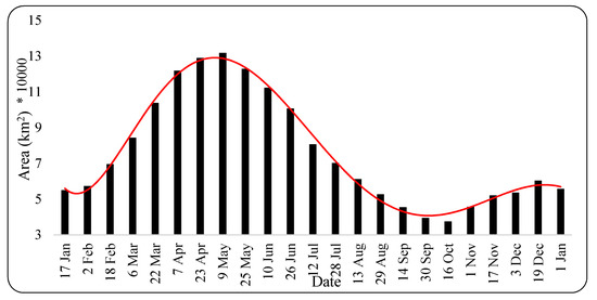 Figure 3 shows the average vegetation coverage in the study area during the whole study period. This figure reveals that the NDVI gradually rose from the first of January (with 8% of the study area), and the rise was continuously seen rapidly until late April and the first of May with about 20% of the area (about 132,000 km2). From the tenth of May, the vegetation coverage gradually decreased, and the coverage reached its minimum yearly coverage at the mid of October with 6% vegetation coverage (about 37,500 km2). The vegetation coverage experienced a very weak rise from late November to middle December, and then a falling trend was observed. Accordingly, the main growing season in Afghanistan starts around the first of January and ends in the first ten days of May (Figure 3).