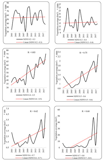 The annual variation rates of the different types of NDVI coverage (0.2–0.3, 0.3–0.4, 0.4–0.5, 0.5–0.6 and >0.6) were calculated for each pixel for the study area by multiplying the number of pixels with different NDVI values (0.2–0.3, …) to the area of each pixel (62,500 m2) between 2001 and 2018. The temporal trend of annual NDVI coverage showed heterogeneity in the study area. Two types of vegetation (NDVI 0.2–0.4) show no trend, and the other types of vegetation (0.41–0.8) show a significant increasing trend. Figure 4 shows the temporal trends of the annual coverage of NDVI in the area.