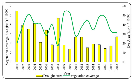 The relationship between vegetation coverage area and areas of DA and NDA in Afghanistan between 2001 and 2018.