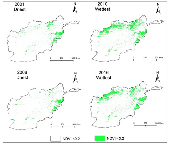 Annual mean NDVI for the driest and wettest years in Afghanistan between 2001 and 2018.