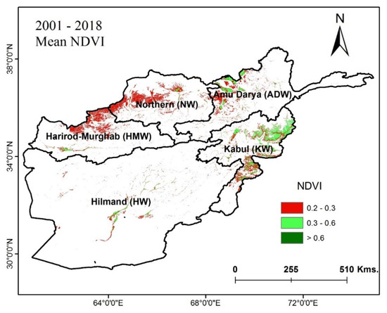 Afghanistan offers a variety of ecological conditions, meaning that different vegetation types cover the land surface. These vegetation types exhibit high biodiversity since the floristic influence from various neighboring regions is an important factor in floristic and vegetation patterns. Afghanistan lies at the “crossroad” of several biogeographical regions. While it is a very dry country, scarce rainfall varies by region and among lowlands and mountains. The country experiences a semi-arid and strongly continental type of climate with major daytime and night-time temperature fluctuation. The eastern parts receive partly monsoonal rains in summer as the basis for the occurrence of various forest types that, however, are strongly degraded or deforested nowadays [48]. Vegetation all over Afghanistan has been severely influenced by human activities, and only a few high mountain and very dry desert areas retain a quasi-natural vegetation cover [49]. Desertification is a commonly known problem in most countries of the dry Middle East, Central Asia, and Afghanistan. In most parts, the vegetation depends on the winter rain, while in the south, winter rains are often irregular. Rainfall increases to the north and east resulting in better vegetation conditions in these parts. The eastern parts also receive some monsoon rains in summer [50]. Until recently, there are few studies on the relationship between climatological factors with drought and vegetation of Afghanistan, especially from a watershed point of view. In terms of ecological sustainability, Afghanistan is subject to deforestation, desertification, and severe soil erosion. Given that in this county, most of the watershed areas and their critical points are located in mountainous and hilly areas, these areas usually have very sparse or no tree cover. Studying vegetation dynamics and their link to drought in the region is very important to the ecological sustainability of this country.