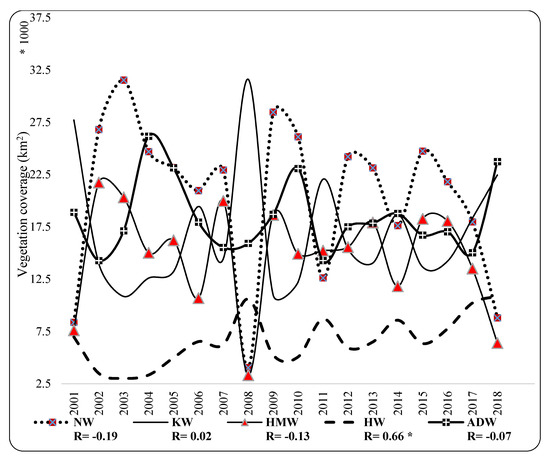 In the study period, there was a significantly positive rising trend in vegetation coverage in HW with R = 0.66 (p value = 0.05). The other watersheds do not exhibit a significant trend, but a negative falling trend was observed in HMW and NW. Also, the figure shows the inter-regional and interannual vegetation coverage for the five main watersheds in the study area between 2001 and 2018. Note that there is a different attitude between the main watersheds, especially KW and HW watersheds that are influenced by Indian Monsoon (Figure 8). On the other hand, KW and HW located in the Eastern and Southern parts of the country are affected by the monsoon from the Indian sub-continent [57].