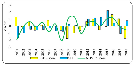 Figure 9 shows the relationship between yearly NDVI coverage with annual precipitation and LST in Afghanistan. It is observed that there is a significant correlation between NDVI with precipitation (p = 0.03, r = 0.51) and an insignificant relationship between NDVI with LST (p = 0.55, r = 0.15). The years 2001, 2002, 2008, and 2017 had the minimum precipitation (107.7, 219.8, 250.6, and 203.4 mm, respectively), and years 2012, 2013, 2014, and 2015 had the maximum precipitation (511, 536.3, 548.2 and 692.2 mm, respectively). The agricultural sector is highly vulnerable to changes in rainfall patterns, increased LST, and snowmelt. Agricultural productivity and crop choice availability are impacted by reduced river flow from earlier snowmelt, increased soil evaporation, and less frequent rain during peak cultivation seasons [47]. The harmony between the driest years with NDVI coverage is clear in the years 2001 and 2008, but not obvious in the years 2002 and 2017, which, despite the drought, experienced an increase in NDVI coverage. Also, the years 2001, 2013, 2016, and 2017 were the hottest years (20, 19.7, 20.3, and 19.8 °C, respectively) and years 2008, 2009, 2010, and 2018 (18.17, 17.07, 17.82, and 17.08 °C, respectively) were the coldest years. It can be concluded that the LST by controlling the soil moisture has a key role in increasing/decreasing trend of NDVI coverage in the study area. For example, in the year 2001 because of low SPI and high LST, it was one of the lowest coverages of NDVI (40,010 km2), due to decreasing soil moisture in relation to high LST and water sacristy as a result of low precipitation. On the other hand, in the year 2008, because both LST and SPI were lower than normal value, the least NDVI coverage occurred (35,457 km2). The year 2008, as the driest (less vegetation coverage) year, is the last year of a period of 8 dry years with precipitation lower than normal. Therefore, it was clearly observed that, after a long continuous period (8 years) with drought conditions, all types of vegetation coverage had been affected, and finally, the year 2008 was the driest during the study period. On the other hand, a drought occurred in the year 2017 after five wet years during the study period. Hence, despite with LST higher than normal and precipitation lower than normal, both of them can cause a stressful situation for vegetation coverage. However, due to the facts of existing sufficient water supplies, having enough surface and ground waters, as well as the development of irrigation areas, the year had a normal situation in vegetation coverage. In 2009 and 2010, despite that the precipitation was tightly near the historical normal, the NDVI coverage was the highest in the study period because the LST was below normal. In contrast, even in the years 2014 and 2015, which were the wettest years in the study period, NDVI coverage could not reach the highest level because of low LST (Figure 9).
