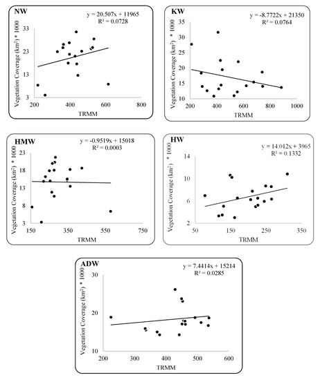 Figure 10 shows the relationship between vegetation coverage and precipitation in the study area between 2001 and 2018. It demonstrated that there was no significant correlation between vegetation coverage and precipitation. Also, the correlation was found to be near zero (R = −0.02) in HMW, while positive correlations were observed in NW, HW, and ADW with R = 0.27, 0.36, and 0.17, respectively, and negative correlation was seen in KW with R = −0.28. Thus, it seems that, in these regions, vegetation coverage cannot be predicted just by using the precipitation, as further illustrated in Figure 8. This finding is not completely the same as that found by Ji and Peters [33]; vegetation greenness can be predicted using current and antecedent precipitation. Such inconsistent findings are a result of the fact that the previous research [34] did not considered temperature as an influencing factor in their study. That is, temperature plays an important role to alter the vegetation pattern in the semi-arid and arid regions, such as middle east and Afghanistan.