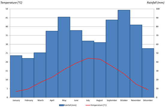 This study area is located in the south-east of France (45°45′35″N, 4°50′32″E). According to the Köppen–Geiger classification [79,80], it has a continental temperate climate, fully humid with hot or warm summer, depending on the year (Figure 2). The hottest months are July and August, with average maximum temperatures of 27.7 °C and 27.2 °C, respectively. The wettest months are May and October with 90.8 mm and 98.6 mm, respectively. The sunniest months are June, July, and August with 254.3 h, 283 h and 252.7 h, respectively (Figure 2).