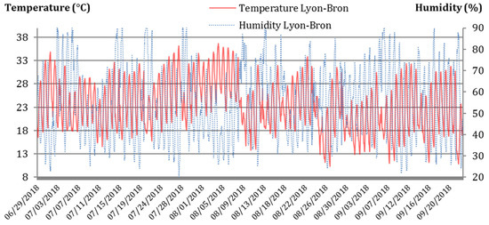Hourly measurements of temperature (°C—red line) and humidity (%—blue dotted line) at the Météo-France Lyon-Bron station from 06/28/18 to 09/24/18.