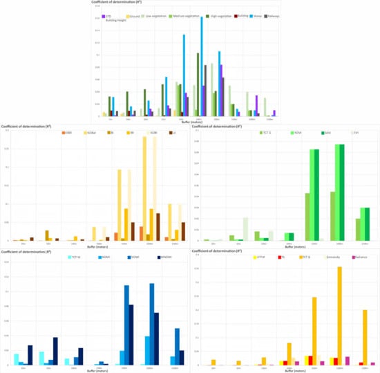 The aim of this study is to model air temperature using the linear regressions, multiple and partial least square regressions, and nonlinear regression by the random forest regression, from selected predictors. Initially, the scale with the best correlation between air temperature and explanatory variables was selected for each indicator based on a proximity buffer analysis (5 to 1000 m; Figure 5). Thus, the selected buffer zone varies for indicators of the presence of vegetation, water, humidity, bare soil and buildings, radiation indices, proximity to land use, urban morphology, and finally climate data (Table 5). Each of the measuring points was compared with the average of the indicator concerned, according to the size of the buffer considered.