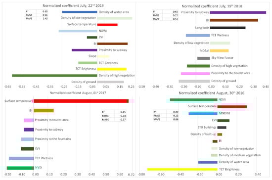 After removing the collinear variables for each day, the predictors involved in air temperature modelling provide significant coefficients of determination. These ranged from 0.60 for 22 July 2019, to 0.89 for 30 August 2016, with RMSEs of only 0.96 °C and 0.23 °C, respectively. Moreover, each variable retained in the model was characterized by a normalized coefficient that corresponded to the weight of this explanatory variable. This weight varies according to the study days (Figure 8). The probability associated with Fisher’s F (Pr>F) was always less than 0.05 and very often less than 0.0001.