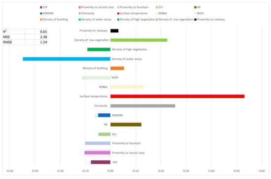 The results for the sample with all measurements for the four outputs (Figure 10) show an R2 of 0.65 and an RMSE of 1.54. The results for the sample with all measurements for the four outputs (Figure 10) show an R2 of 0.65 and an RMSE of 1.54. The RMSE is logically slightly higher than for the single day models due to the larger sample of measurements and greater morphological diversity, even though the weather conditions remain similar. These results confirm the general trends observed at day scales. In particular, the cooling effect of variables such as water density (normalized coefficient of –0.35; Figure 10), densely vegetated areas (–0.11 for NDVI and –0.09 for the density of high vegetation), road embankment (–0.08 for SVF), and humidity (–0.05 for Modified Normalized Difference Water Index (MNDWI)) can be found. The presence of proximity to tourist areas can be explained by the fact that these areas are mostly made up of green spaces or historic buildings in old Lyon.