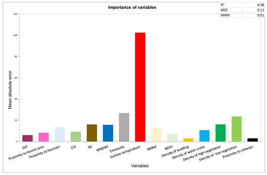 Global random forest modelling based on all days highlighted the dominant role of surface temperature, which had a mean error increase of 102.5 (Figure 12). This was followed by emissivity, density of low vegetation, IBI, and density of high vegetation with mean error increases of 26.9, 23.5, 16.2, and 16.2, respectively (Figure 12). These results are in agreement with those obtained using multiple linear regression and PLS regression.