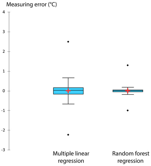 The third type of regression tested is the random forest regression. This is a predictive model using binary decision trees [101]. From an observation sample, the bagging method will generate several possibilities before selecting only one. This machine learning technique [102] is based on Classification and Regression Trees (CART). These are constructed from different bootstrap samples, randomly selected with random discounting, in order to obtain, after aggregation, a robust and efficient set of air temperature predictors [103]. The importance of each variable is calculated by the mean increase in error of a tree in the forest, i.e., when the values of each variable are randomly swapped in the out-of-bag (OOB) samples. The variables used in the nonlinear regression, random forest, to model air temperature are derived from the selection of multiple linear regressions for each day. The random t forest classification and regression has the advantage of reducing white noise, and thus potentially improving the correlation coefficients and RMSE already obtained by multiple linear regression. In addition, the number of variables in the bagging and the number of trees used are user-defined parameters. When the number of trees increases, the general error converges to the same value. Overfitting is then not a problem due to the large numbers law. Despite this, the number of analysed trees must be limited in order not to excessively increase the computation time (1):