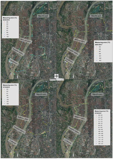 Most of the studies based on mobile measurements have been carried out using automobiles, for example in Portland (USA) [63], in Nancy (France) [44,64], in Los Angeles (USA) [65], in Hong-Kong [66], in Brno (Czech Republic) [67], or in Sfax (Tunisia) [68,69,70]. However, there are many inherent limitations of motorized transport. An increase in temperature may be observed when the car stops or slows down due to red lights or traffic jams. The proximity of other cars combined with the immobility of the vehicle may explain this. On the contrary, when the speed of the car increases, cooler temperatures may be observed due to the cooling of the speed of travel. Thus, this measurement method limits the route to be monitored because of the many one-way streets or pedestrian areas. Consequently, in this study, the choice to do bicycle measurements was made. These bicycle measurements already exist but are not so frequent. For example, they have been used in some areas such as in Rotterdam (Netherlands) [71], in Shenzhen (China) [72], in Ohio [73], in Utrecht (Netherlands) [74], and on foot in Vancouver (Canada) [49].