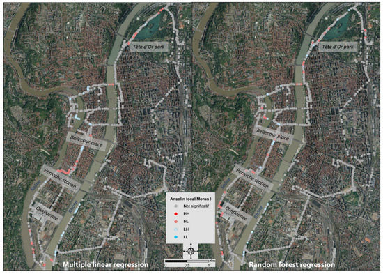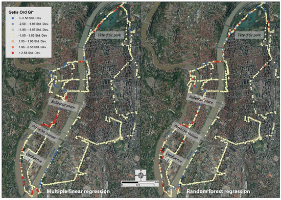 The spatial autocorrelation of the difference between the modelled air temperature and the air temperature measured by the mobile measurements was analyzed, on one hand, using the Anselin Local Moran I spatial association indicator (LISA) [107], and, on the other hand, using the degree of clustering of high and low intensity values by the Getis Ord General G (Gi*) [108,109].
