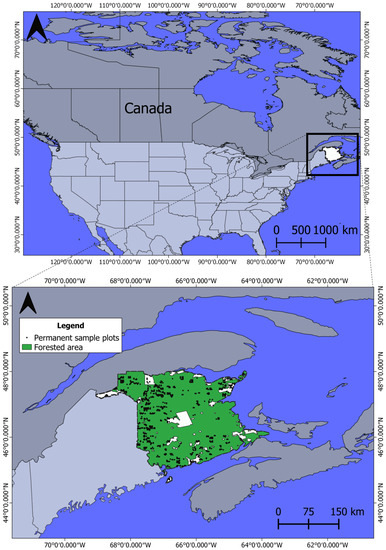 In this study, we used permanent sample plots (PSP) monitored by the New Brunswick Department of Natural Resources and Energy Development [54] and J.D. Irving Ltd. (n = 813). Almost all the PSP plots were distributed as a grid of 2 km × 2 km while the others were randomly distributed in stands of high values and intensively managed, 1/10th of the plots were measured annually.