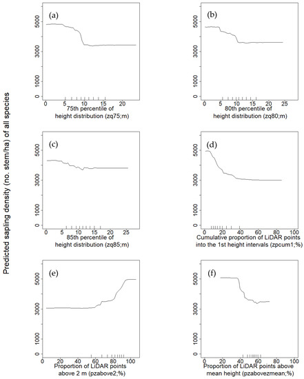 Partial dependence plots of (a) 75th (zq75), (b) 80th (zq80), and (c) 85th (zq85) percentiles of height distribution, (d) proportion of points in the first interval from ground (zpcum1), (e) proportion of LiDAR points above 2 m (pzabove2), and (f) proportion of LiDAR points above mean height (pzabovezmean; %) of random forest predictions of sapling density of all species (stems/ha) using both sensors.