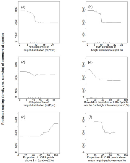Partial dependence plots of (a) 75th (zq75), (b) 80th (zq80), and (c) 85th (zq85) percentiles of height distribution, (d) proportion of points in the first interval from ground (zpcum1), (e) proportion of LiDAR points above 2 m (pzabove2), and (f) proportion of LiDAR points above mean height (pzabovezmean; %) of random forest predictions of sapling density of commercial species (no. stem/ha) using both sensors.
