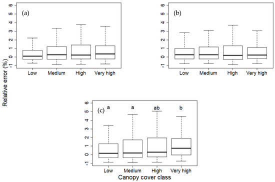 Distribution of the relative error (%; Equation (3)) as a function of canopy cover class (low: 0% to 24%, medium: 25% to 49%, high: 50% to 74%, and very high: ≥75%) for models estimating sapling density (stems/ha) of all species. (a) Model integrating both sensors, (b) model including LiDAR and environmental variables, and (c) model including spectral and environmental variables (Kruskal–Wallis test, (a) p = 0.30, (b) p = 0.92, and (c) p = 0.006). The groups a are statistically similar between them and different from group b, whereas group ab is statistically similar to group a and b.
