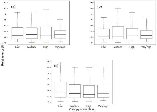 Distribution of the relative error (%; Equation (3)) as a function of canopy cover class (low: 0% to 24%, medium: 25% to 49%, high: 50% to 74%, and very high: ≥75%) for models estimating sapling density (stems/ha) of commercial species. (a) Model integrating both sensors, (b) model including LiDAR and environmental variables, and (c) model including spectral and environmental variables (Kruskal–Wallis test, (a) p = 0.85, (b) p = 0.99, and (c) p = 0.72).
