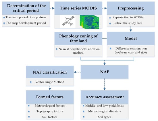Hence, the overarching goal of this study was to build a NAF model based on remotely sensed imagery to better understand the spatial and temporal dynamics of farmlands. The constructed NAF model was then validated to assess its accuracy from three aspects: agricultural disasters, soil types and medium- and low-yield fields. The model was applied in a case study in Heilongjiang Province, China, to determine the driving factors by observing the NAF patterns in the region.