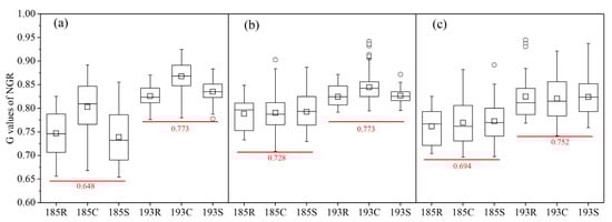 Threshold (red numbers) and the G values of NGR of different crops in three typical farms in 2016. (a) Keshan farm, (b) Yaluhe farm, (c) Hailin farm.