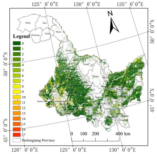 Spatial distribution of NAF in Heilongjiang Province from 2000 to 2016. “0–17” respectively represents the numbers of poor crop growth years.