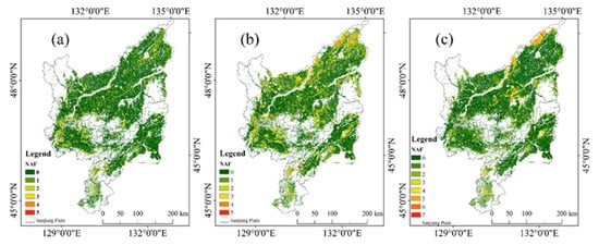 The NAF were more related with temperature on northwest of Xiao Hinggan Ling. The correlation between NAF and temperature in Nenjiang and Heihe county was 0.38 and 0.24 (Table 2), respectively. Taking Nenjiang county as an example, the average temperature of Nenjiang county during the main growing period from 2000 to 2016 was 13.63 °C. The temperature was higher (14.32 °C) in 2002 than that in 2013 (12.95 °C), but the NAF in 2002 was lower than that in 2013 (Figure 11a,b).
