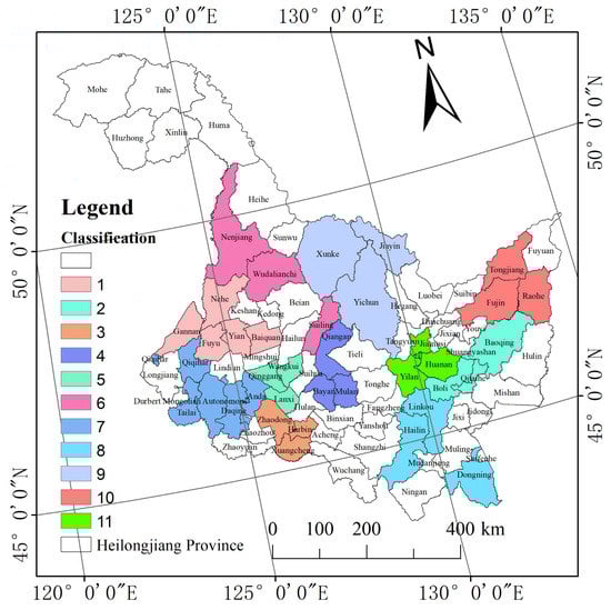 The vector angle method was used to classify the regions where the variation tendency in the NAF was consistent from 2000 to 2016 in 80 counties of Heilongjiang Province. when the cosine values between two counties are greater than 0.88, they belong to the same category. Therefore, 80 counties were divided into 11 categories (Figure 8), clearly demonstrating that almost all adjacent counties in the same category. For instance, the five counties of Qiqihar, Tailai, Durbert, Daqing and Anda on Songnen Plain were classified into the same category, and the three counties of Tongjiang, Fujin and Raohe on Sanjiang Plain were classified into the same category as well. Moreover, four categories were selected from 11 categories to map the interannual variation in the NAF in similar regions from 2000 to 2016 (Figure A7). The curve trends of Nehe, Gannan, Yi’an, Fuyu and Baiquan county were the most consistent, as seen in Figure A7a, and the curves in Figure A7b–d showed roughly the same trend.