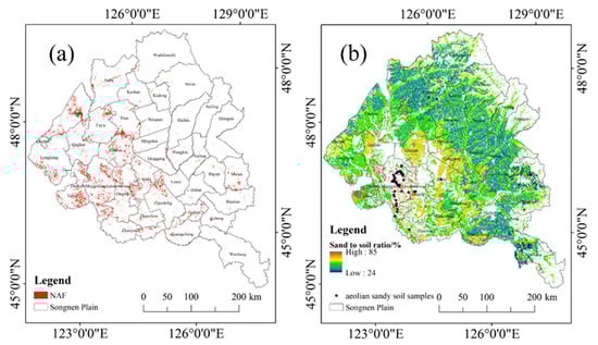 According to our knowledge, we analyzed the formed factors of NAF patterns from soil properties and meteorological conditions. Figure 9a clearly showed the NAF of Songnen Plain distribution was mainly in the southwest. The NAF area accumulated more than 8 years in 17 years is 4.22 thousand km2 on Songnen Plain. Combining the field samples and the soil-sand distribution (Figure 9b), most of the soil types in the NAF of the southwestern Songnen Plain were saline-alkali soil, aeolian sandy soil and sandy soil, which are low organic matter and weak water holding capacity [], leading to the long-term poor crop growth in these areas. At the same time, the NAF accounted for more than 10% of the total farmland area (Figure 5), indicating that the soil texture has a greater influence on the NAF in Duerbote, Daqing, Tailai, Gannan, and Longjiang county than the meteorological conditions.