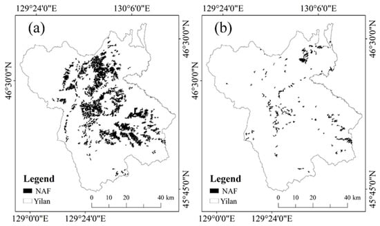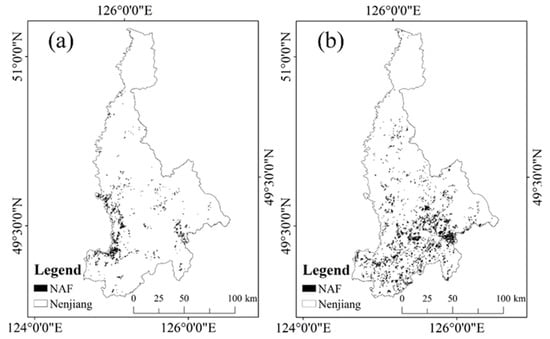 (a) Distribution of NAF in Nenjiang in 2002, (b) Distribution of NAF in Nenjiang in 2013.