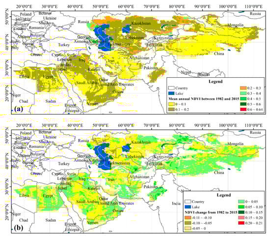 Mean annual NDVI (normalized difference vegetation index, (a) and its change range (NDVI2015–NDVI1982, (b) in desert areas over the Silk Road Economic Belt between 1982 and 2015.
