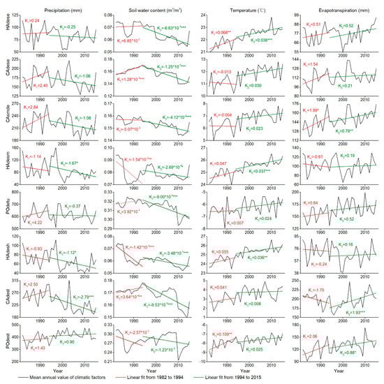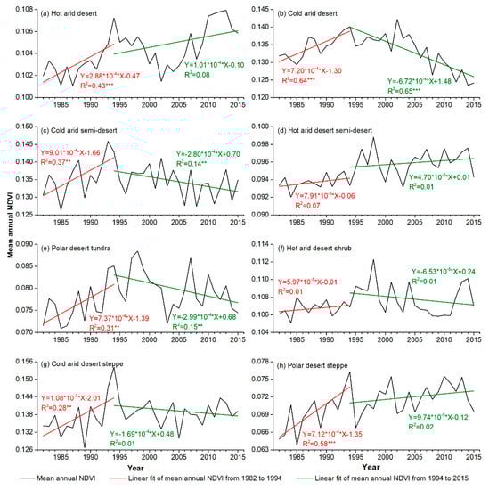 According to the preliminary investigation of the raw data, we found one obvious turning point (i.e., the change rate before and after which has the maximum difference) of the mean annual NDVI. Therefore, two piecewise linear regression models were applied to assess the change trends of the mean annual NDVI, precipitation, soil water content, air temperature, and evapotranspiration in different desert areas, and the change rates were quantified by the slopes of the linear regressions [].