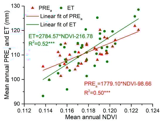 The correlation between mean annual available precipitation, mean annual evapotranspiration, and mean annual NDVI in all desert areas over the Silk Road Economic Belt between 1982 and 2015. *** indicates statistical significance at p < 0.01. PREa—Available precipitation, ET—Evapotranspiration.