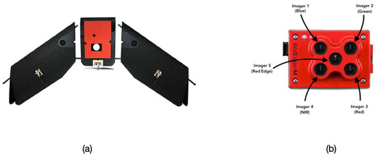 Figure 2a) was used to acquire image data of all the fields and regions on a cloud-free day, August 20, 2017. This UAV is equipped by the manufacturer with a global navigation satellite system (GNSS) receiver and an inertial measurement unit (IMU). A multispectral camera (RedEdge, Micasense, Seattle, WA, USA;